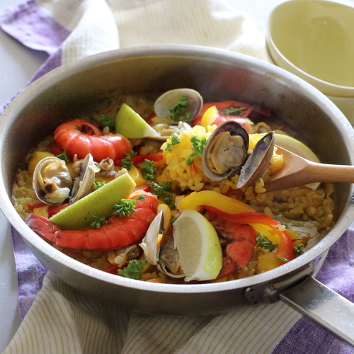 シーフードの旨みたっぷりの本格パエリアは、子どもから大人まで大満足できるボリューム料理。海鮮から野菜までいろいろな具材を楽しめるので、あまり野菜を使いたいときにもおすすめです。仕上げのレモンとパセリで風味を添えれば、食欲中枢を刺激するごちそうプレートが完成。火加減と調理手順を守れば、失敗することもほぼなし。親子で一緒に作りたくなる一品です。