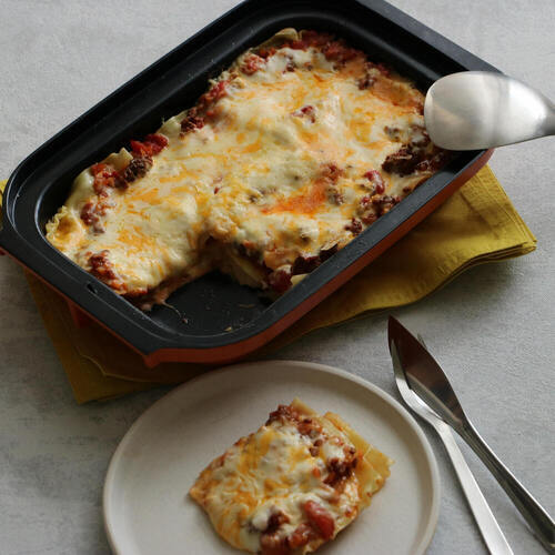 友人を招いてのホームパーティーなど、大人数で楽しく美味しく食べるプレート料理なら「まるごとラザニア」がおすすめ。見た目も味も大満足できるラザニアは、一見すると手間がかかりそうですが、マルチグリルをお持ちの方は、キャセロールを使うことでパスタを茹でる時間が不要に。とろ~りチーズと濃厚ソースが絡み合う焼きたてのラザニアは、そのままテーブルに出すだけで、パーティーのメインディッシュになります。にぎやかな食卓にふさわしい一皿です。