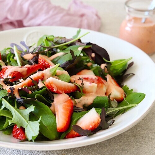 ビタミン豊富ないちごを具材とドレッシングに使った冬のサラダレシピがこちら。ブレンダーで混ぜるだけのいちごドレッシングは、ほんのり甘くてまろやか。サラダが苦手なお子さまにも喜ばれる、やさしい味わいが楽しめます。鮮やかなグリーンが印象的なベビーリーフにフレッシュないちごを添えれば、おうちパーティーの前菜としても大活躍。野菜と果物がまとめて食べられる一皿は、パーティーや休日ランチにおすすめです。