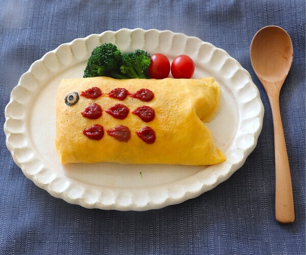 いつものオムライスが、子どもの日のシンボル「こいのぼり」に大変身!見た目のインパクトは抜群なのに、作り方はとても簡単。お子さまと一緒に作るのもおすすめの一品です。ポイントは、ケチャップを等間隔に9箇所絞り、爪楊枝で右から左になぞること。これだけで、きれいなウロコ模様が完成します。スライスチーズと海苔で目をつければ、あっという間に愛らしい表情に。付け合わせにブロッコリーやミニトマトを添えれば、彩りも栄養バランスもばっちりです。「こいのぼりだ!」と子どもが笑顔になる瞬間は、何よりのご褒美。写真にも残したくなる一皿です。