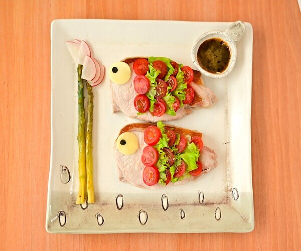 ポークソテーのトッピングを一工夫すれば、お祝い感たっぷりのこいのぼり料理に。ノーリツのマルチグリルのロティプレートを使えば、厚切りのお肉もふっくらジューシーに焼き上がります。さらにおすすめしたいのが、ブライン液に少し漬けるひと手間。水・塩・砂糖を合わせた液に漬けることで、驚くほどしっとり柔らかに仕上がります。かたくなりがちな厚切り肉も、お子さまが食べやすい食感に。仕上げに、レタスやトマトをうろこに見立てて盛り付ければ、見た目も楽しい鯉のぼりポークソテーが完成。ボリューム満点で食べ応えがあり、成長期の子どもにも嬉しいメニューです。